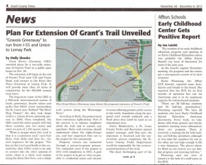 The Great Rivers Greenway (GRG) district unveiled plans for the Gravois Greenway, a two-mile extension to Grant’s Trail, at an open house held for the public November 26. The extension will begin at the end of Grant’s Trail near I-55 and Union Road, and connect to the River Des Peres Greenway at Lemay Park, and provide more than 16 miles of through connectivity for the 650,000 annual trail users.